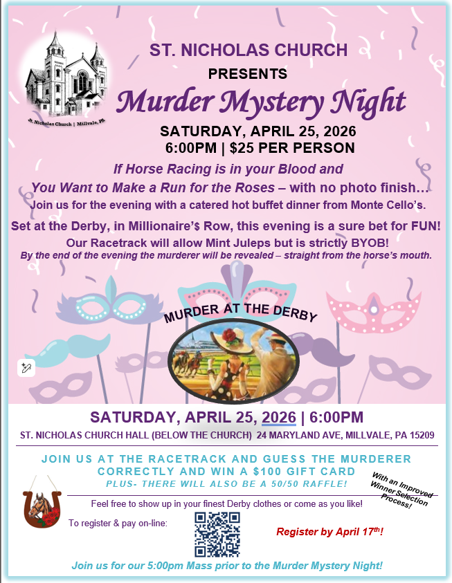 horse’s mouth. Saturday, April 25th 6:00pm | $25 / person St. Nicholas Church Hall (below the Church) 24 Maryland Ave Millvale, PA 15209 DEADLINE TO REGISTER: April 17th Limited Seating for 100 Our First Murder Mystery Sold Out so Don't Delay in Registering! Thanks to your feedback from the first one - we have improved how the winning Murderer Guess is handled!
